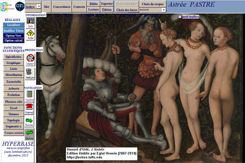 Hyperbase traite la version fonctionnelle de L'Astrée : vocabulaire, majuscules et syntaxe conservés, noms propres uniformisés, graphie et ponctuation modernisées. Hyperbase offre un Index du vocabulaire, un Dictionnaire des fréquences et un calcul des Spécificités et des Coefficients de corrélation. Une mesure de la richesse lexicale et divers tests statistiques complètent le système.