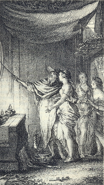 Galathée, Léonide et Silvie regardant le miroir de Climanthe (I, 5, 138 recto)